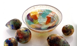 松島さんは、岡山市生まれで、1975年に独学でコアガラスの研究をし、1982年に自宅に工房を開きました。