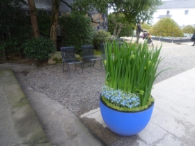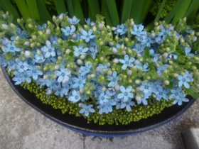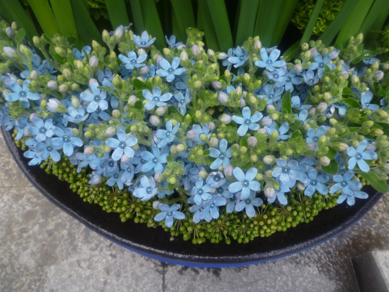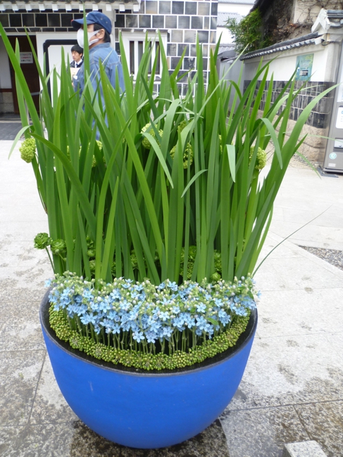 真っ青な鉢とブルーの花が映え、水槽に浮かぶ色とりどりの花々に魅了されました。