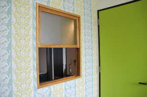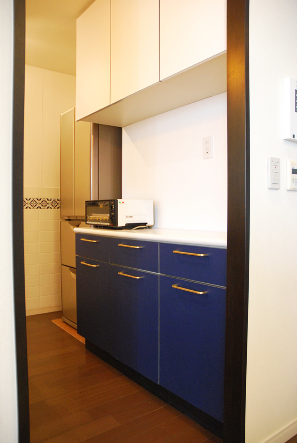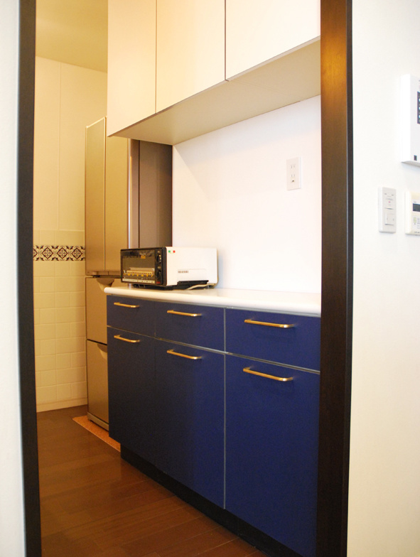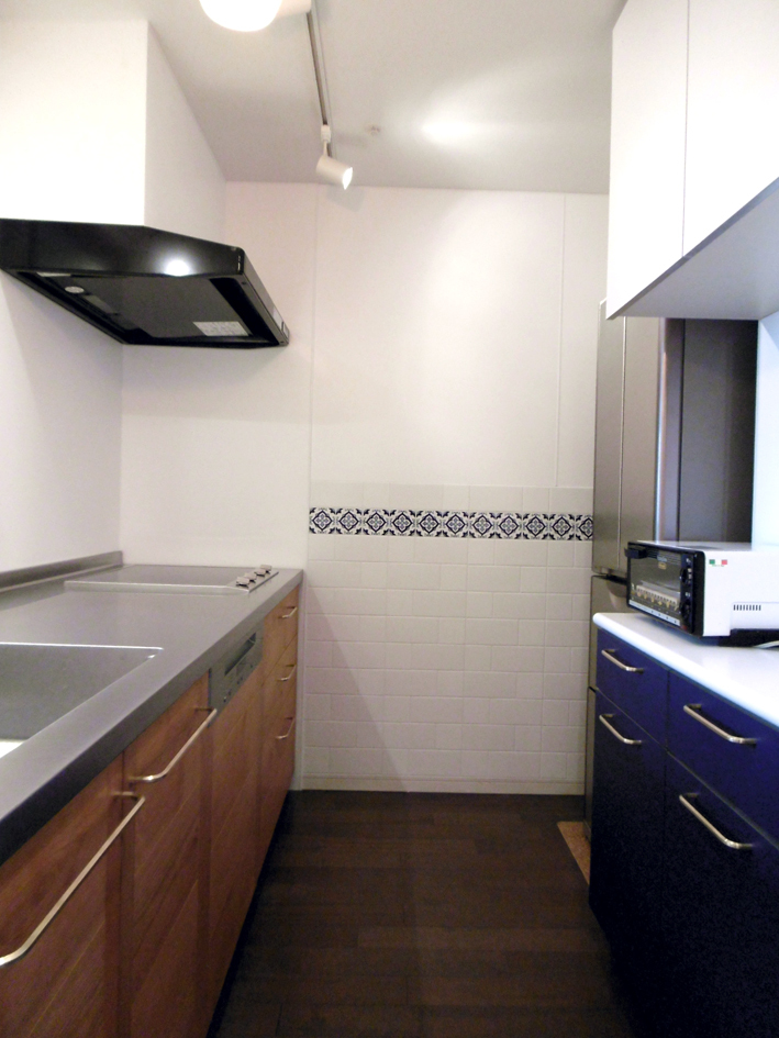 薄暗かったキッチンも、照明器具を交換し、イタリアンタイルと壁、食器棚の扉を変えたら見事に明るくなりました。美しい木製キッチンは、KitoBitoさんでオリジナルをオーダー。山桜の木を選びました。隣接する部屋とキッチンとの壁に大きな木枠の窓を設けることで、光が入る解放的な空間に。