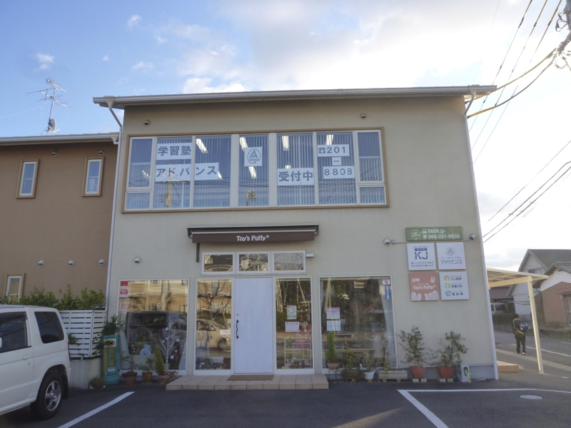 学習塾アドバンスの2Fに、塾のアピールをするため、シート貼りを施工しました。最初は、「目立つ」ことに重点を置いた依頼でしたが、景観やコンセプトカラー、通行者の目線や太陽の動きなどから、このデザインを提案させていただきました。2Fなので、内側からの施工で約1時間10分ほどで完成しました。