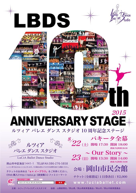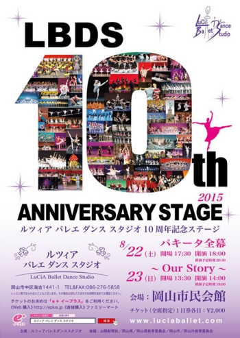 LuCiA Ballet Dance Studioの10周年記念ステージ!今回は、チラシ・チケットのデザインをアップします。8/22(土) 開場17:30 開演18:00 終演予定20:30「Paquita(パキータ)全幕」8/23(日) 開場13:30 開演14:00 終演予定18:00「Our Story」LBDS本部とe+(イープラス)で2日とも全指定席です。各日¥2,000岡山市民会館