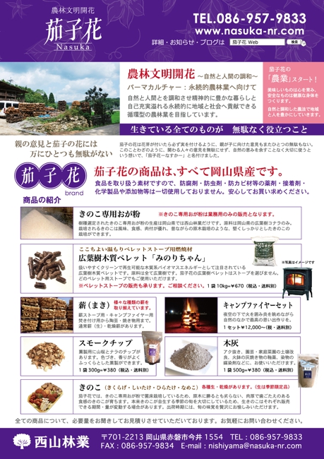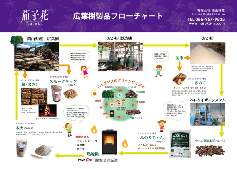 岡山県産の広葉樹を使った製品を製造販売されている有限会社 西山林業さんの、「商品紹介チラシ」と、「広葉樹フローチャート」をデザイン、制作しました。11月には、(有)西山林業にて「ペレットストーブぬくもり体験会」が開催されます。日時:11/7(土)・8(日)11:00〜15:00場所:(有)西山林業住所:岡山県赤磐市今井1554